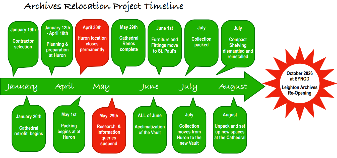 Friday, May 29, 2026 will be the last day to submit research requests to the Archives that will be answered ahead of the move. The collection will be packed and stored in June and will be inaccessable until it is moved to the Cathedral. Research requests received after this date will be kept in queue until the Leighton Archives have opened and will be answered in order of reciept.
